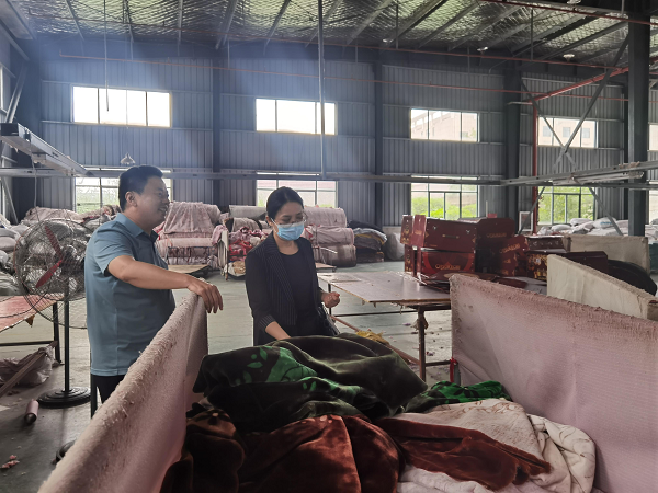 史主席一行首先来到盐城市美逸家纺有限公司进行实地走访调研。在美逸家纺经理和办公室主任的陪同下,现场查看了企业的生产设备、生产车间、办公场所等,详细了解企业在资金投入、生产销售、用工招聘、发展方向等方面的情况,了解企业经营中遇到的困难,还征集了企业对妇联工作的意见和建议。在交谈中,企业的负责人对妇联长期以来的关心支持表示感谢。