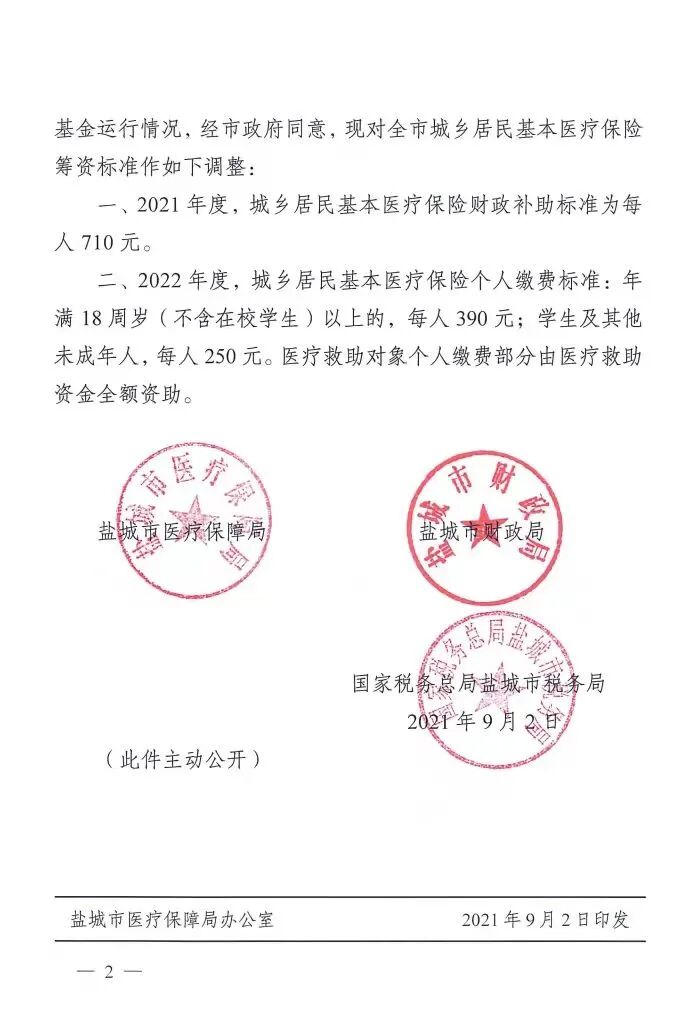 盐城市医保局、财政局、税务局9月2日发出通知,2022年度,全市城乡居民基本医疗保险个人缴费标准为:年满18周岁(不含在校学生)以上的每人390元,学生及其他未成年人每人250元,医疗救助对象个人缴费部分由医疗救助资金全额资助。