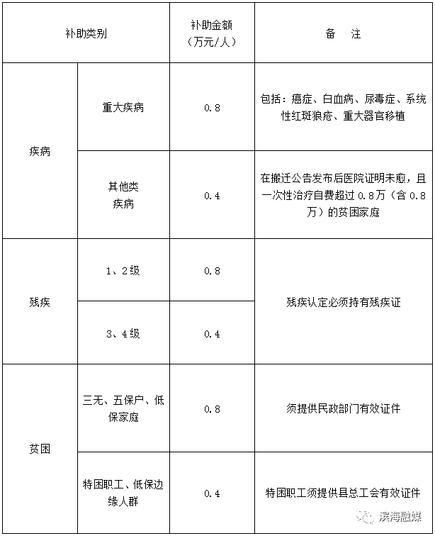 (2)搬迁住宅房屋,被搬迁人及户籍内家庭成员(指配偶、直系亲属及有合法收养关系、监护关系的人员等)因身患重大疾病、残疾和低保对象需要给予照顾的,可适当给予补助,补助对象和标准详见附表。