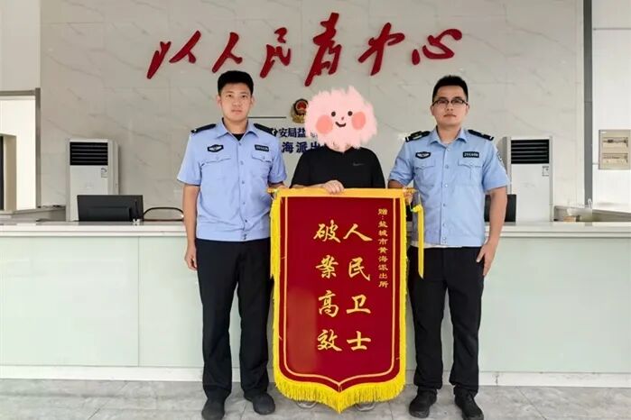“实在是太感谢你们了!”9月18日上午,群众胥先生精心制作一面印有“人民卫士,破案高效”的锦旗送至黄海派出所,以感谢民警为其挽回损失。