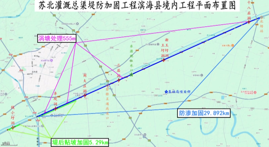 苏北灌溉总渠堤防加固工程在我县境内主要进行钱小圩洞、阜坎洞、刘大庄洞等6座穿堤建筑物的拆建和新王圩洞的加固;同时对南堤堤防加固5.29km、防渗加固29.94km;总渠河道涡塘处理0.555km。该项目的加速推进,不仅为淮河流域及下游地区筑牢防洪安全屏障,更将为区域经济社会高质量发展注入强劲动力,让 “安澜淮河、水润苏北” 的美好愿景逐步变为现实。