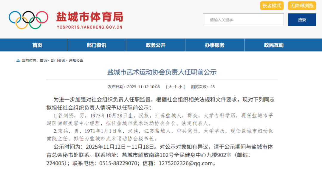公示时间为:2025年11月12日-11月18日。对公示对象如有异议,请于公示期间与盐城市体育总会秘书处联系。联系地址:盐城市解放南路102号全民健身中心九楼902室(邮编:224005);联系电话:0515-88229070;信箱:1275202326@qq.com
