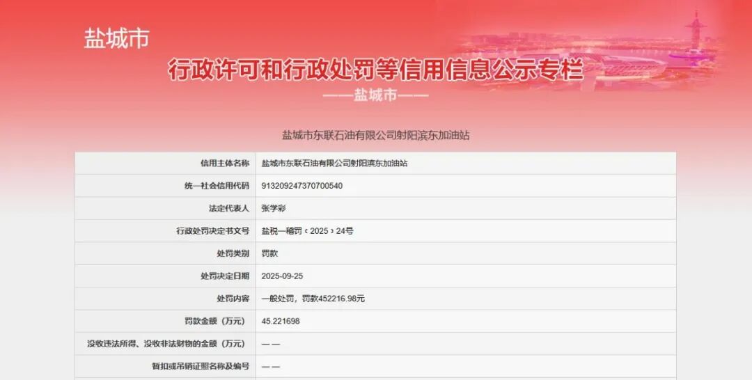 盐城市东联石油有限公司射阳滨东加油站违反税收管理,国家税务总局盐城市税务局第一稽查局依据《中华人民共和国税收征收管理法》第六十三条第一款、《中华人民共和国行政处罚法》第三十二条第一项、《国家税务总局江苏省税务局关于发布<江苏省税务行政处罚裁量权实施办法>的公告》(国家税务总局江苏省税务局公告2018年第11号)第十六条等法律法规,对其罚款45.221698万元。