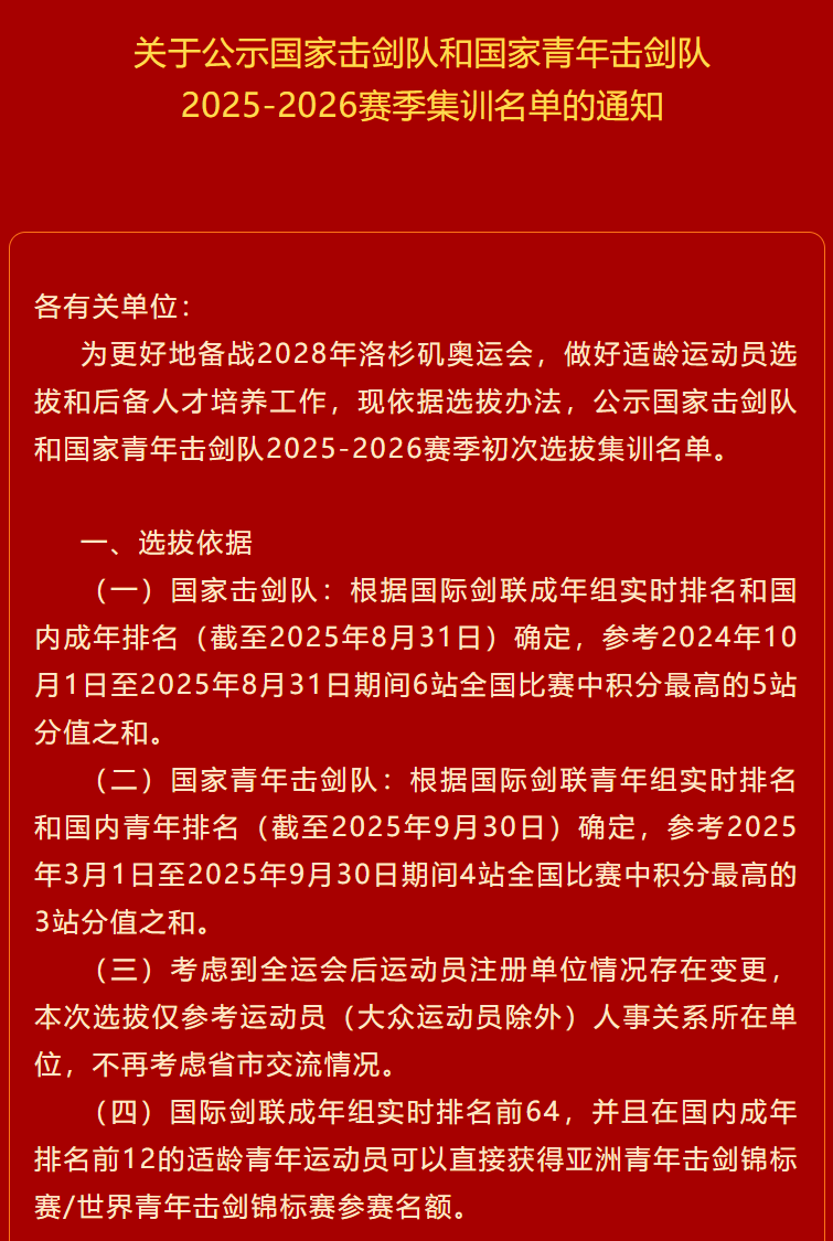 近日 中国击剑协会公布 国家击剑队和国家青年击剑队 2025-2026赛季集训名单