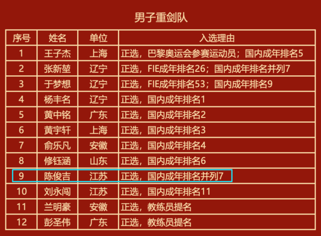 我县运动员 陈俊吉 成功入选 男子重剑队