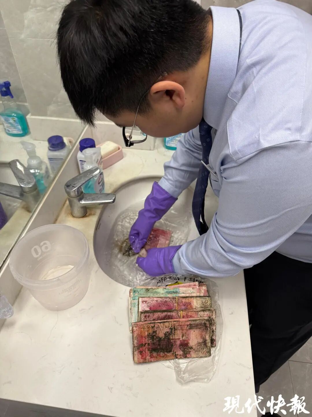 “当时心里真没底,这些钱像被水‘焊’在一起,轻轻一扯就破。”10月25日,徐先生向现代快报记者回忆起那天的情况。由于家中连续降雨,他存放的4万多元现金严重受潮,不仅长满霉斑,还紧紧粘连成一块“纸砖”。 接到求助后,农行建中支行迅速响应。由于纸币已严重霉变,无法使用点钞机,全程只能依靠手工处理。工作人员先用流动清水轻柔冲洗,消毒后,再用细软毛巾一点点吸干水分。“就像在修复文物,动作必须又轻又稳。”一名参与处理的工作人员说。  最难的环节是分离粘连的纸币。工作人员借助竹签、镊子等工具,像“拼图”般耐心揭开每张纸币,稍有不慎就可能造成二次破损。清点时,还需逐张辨认币面金额与真伪,整个过程持续数小时。 “真没想到,这些看起来‘没救’的钱,还能一分不少存回来!”徐先生感慨地说。最终,40950元被成功“抢救”并存入账户。该行相关负责人表示,虽然如今移动支付普及,但偶尔仍会接到类似特殊残损币兑换需求。“不管多麻烦,只要符合规定,我们都会尽力为客户挽回损失。”(受访银行供图) 来源:现代快报/现代+