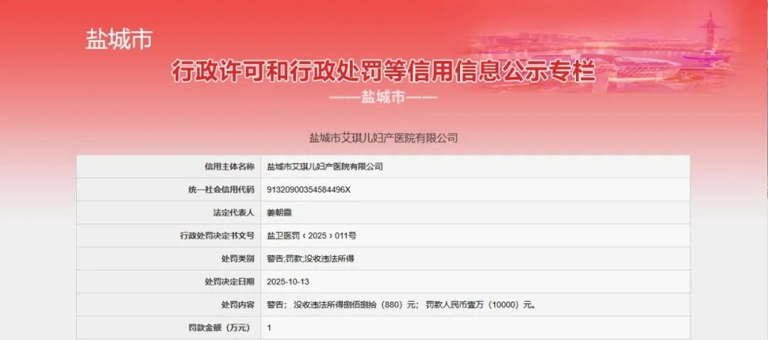 盐城市卫生健康委员会依据《产前诊断技术管理办法》第三十条及《中华人民共和国母婴保健法实施办法》第四十条的规定,对其警告并罚款1万元。