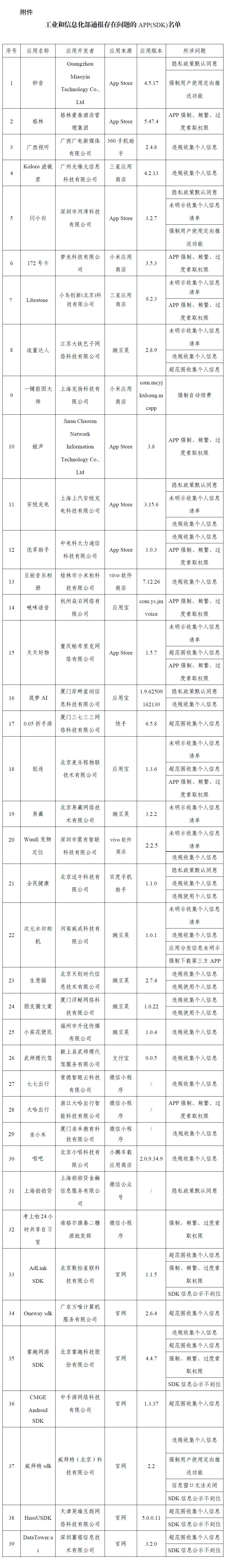附件:工业和信息化部通报存在问题的A(SDK)名单