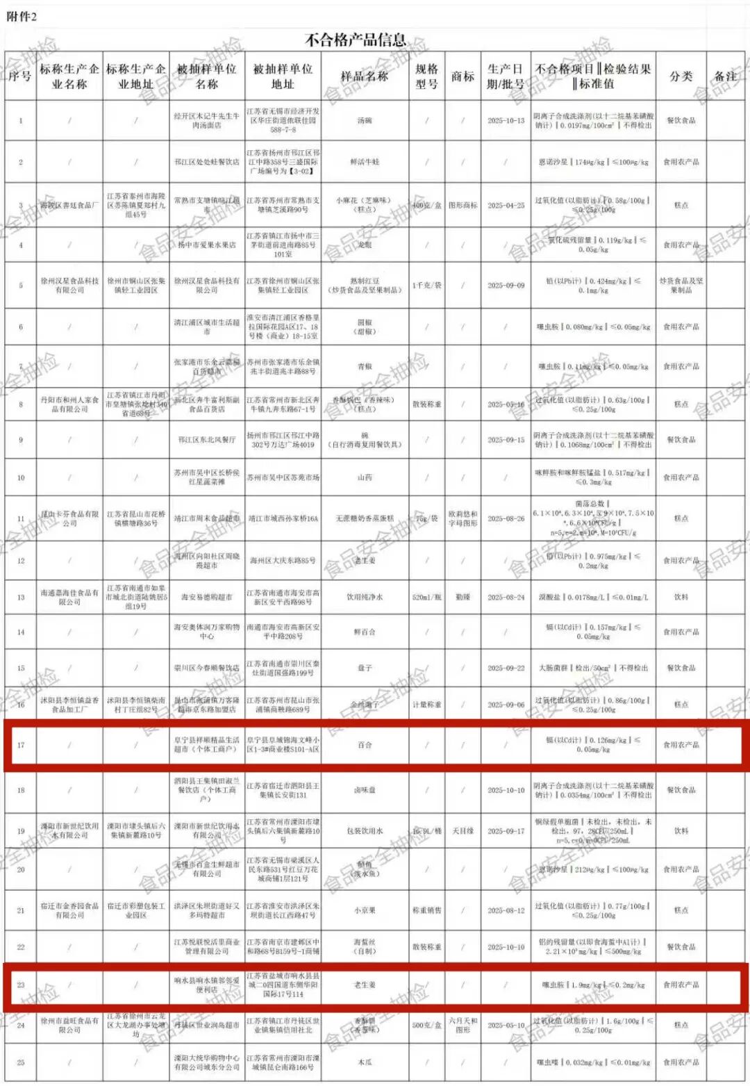 近期,江苏省市场监督管理局组织食品安全抽检,抽取食用农产品、粮食加工品、炒货食品及坚果制品、糕点、饮料、酒类、茶叶及相关制品、食用油、油脂及其制品、餐饮食品、淀粉及淀粉制品、豆制品及薯类和膨化食品等12大类食品1383批次样品,检出其中食用农产品、糕点、炒货食品及坚果制品、餐饮食品及饮料等5大类食品25批次样品不合格。
