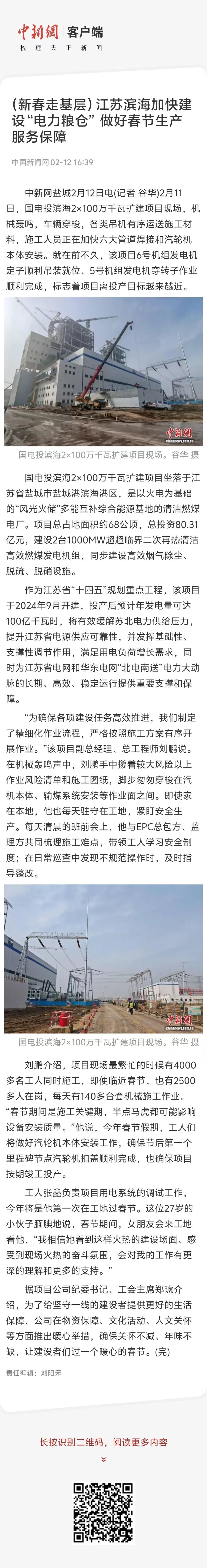 江苏滨海加快建设“电力粮仓” 做好春节生产服务保障▲上下滑动查看全文