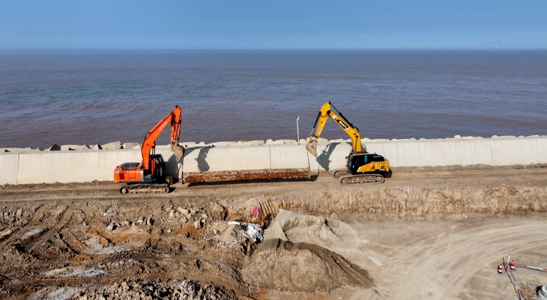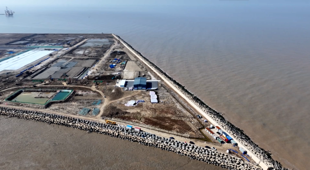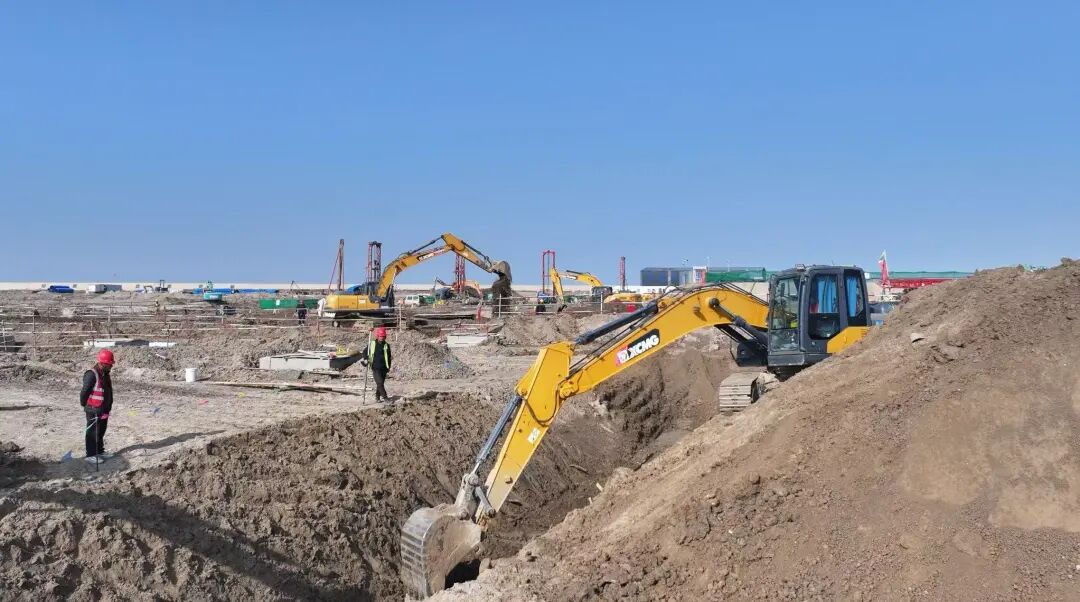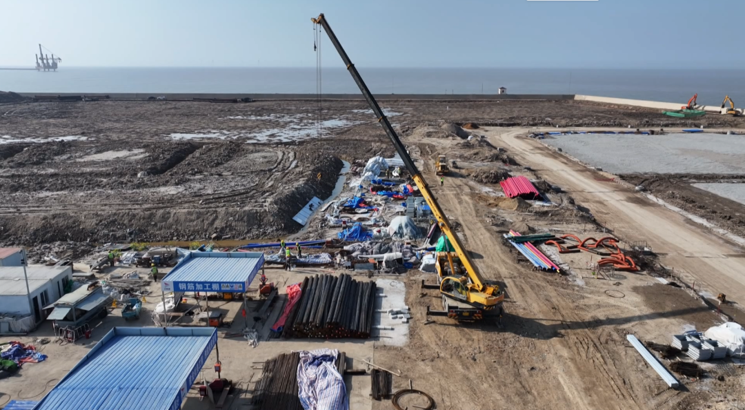 据负责人介绍 目前正重点推进码头主体结构施工 港池开挖以及配套附属设施建设 现场每天投入80多名施工人员 60多台套机械设备 各作业面同步施工、高效推进 接下来将集中力量开展港池陆上开挖 码头面层及堆场施工 力争明年上半年项目具备投用条件