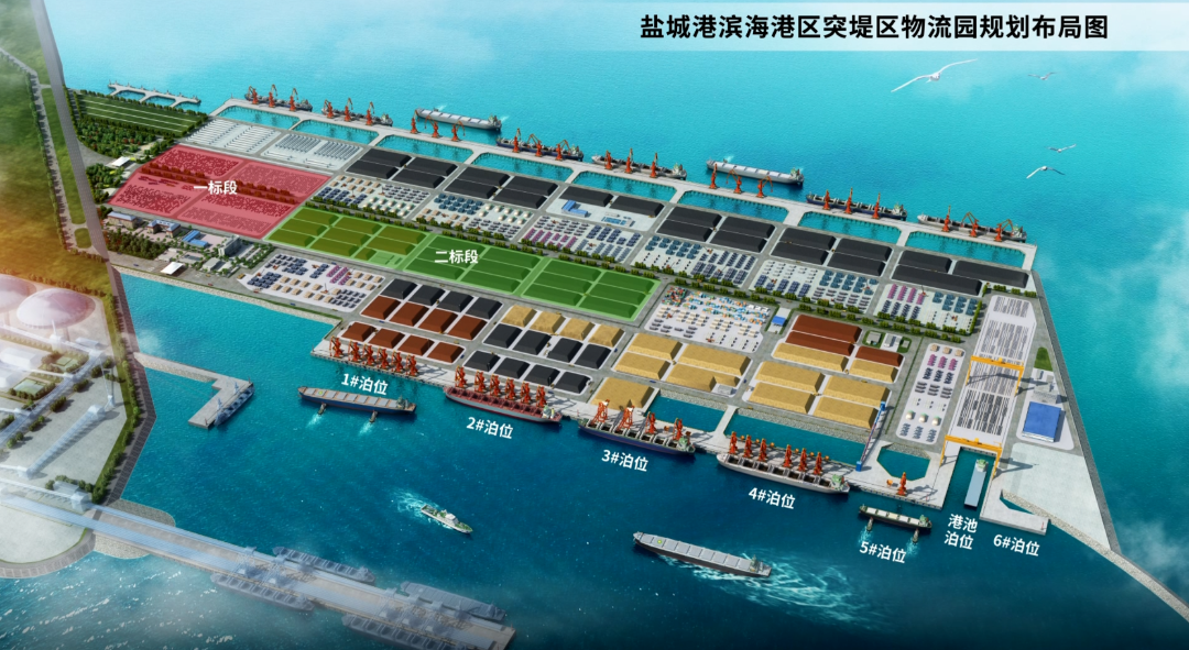盐城港滨海港区北区通用件杂货码头工程是我县补齐港口功能短板、赋能区域向海经济发展的关键性项目。工程新建3个件杂货泊位,泊位总长度438米,设计年通过能力102万吨,其中挖入式港池2万吨级重件泊位,配备2台1500吨级轨道式龙门起重机,可充分满足大型风电设备整体吊装、转运需求。